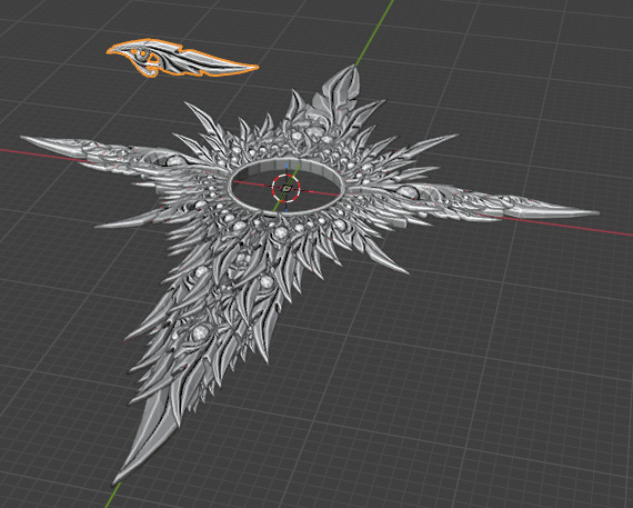 The 3D model is the same feather duplicated 59 times, and then mirrored, with a few left out of the mirror for aesthetic asymmetry.