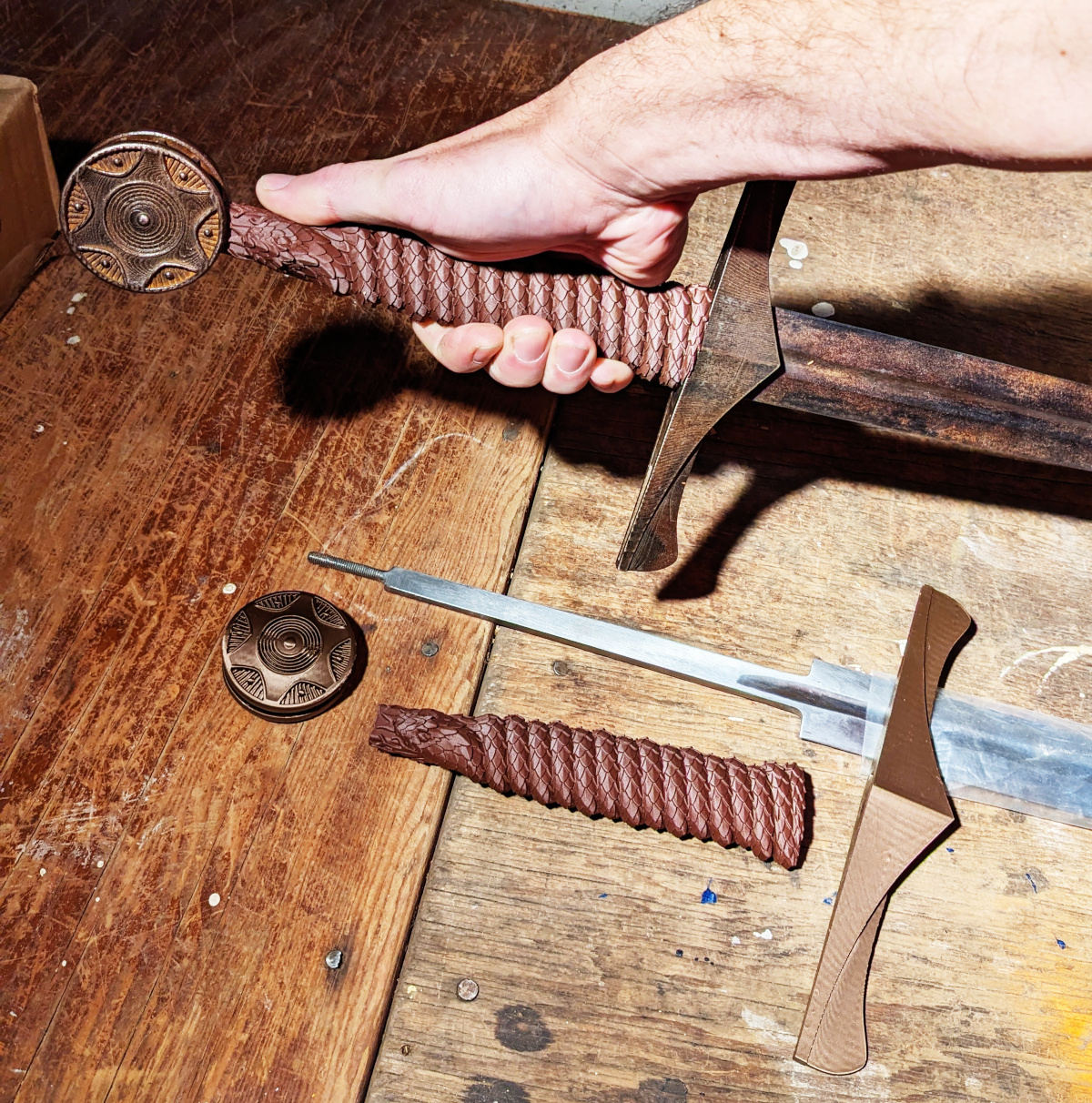 Because the sintered bronze/steel 3D printing tech isn't available right now, I had the metal parts DMLS printed in Titanium (for the crossguard) and 316 SS (for the pommel). The handle grip is printed from wood infused PLA on the office printer. Pictured here next to my own fire-scarred sword.