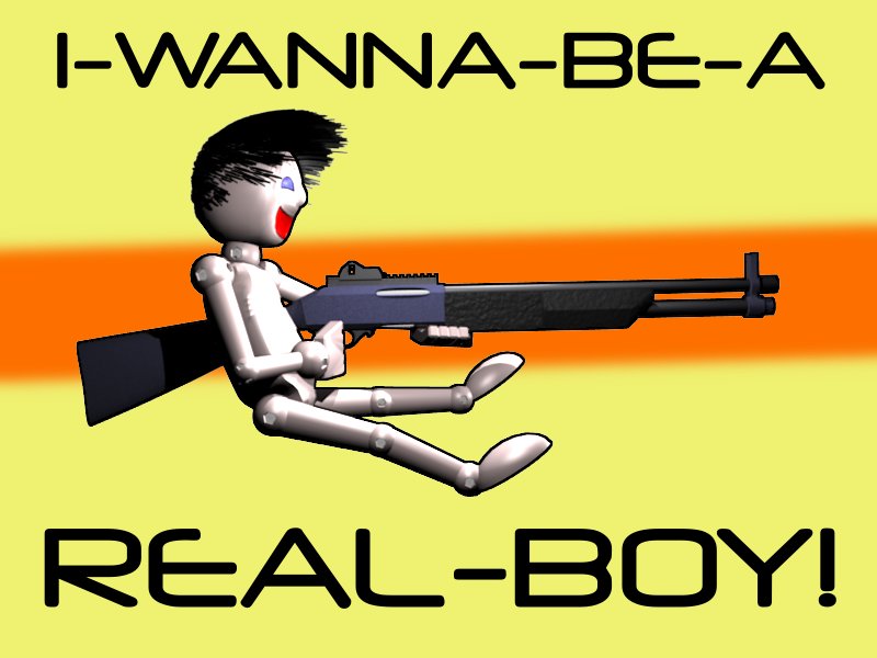 This was a character from a GURPS campaign we did one night. He was a plastic puppet who, pinochio-like, wanted to be a real boy. At least, that's what he kept saying. Between the shotgunning and the emphasis cursing we weren't quite so sure by the end. I'll have to do another image from that campaign some day. It was only a single session on new-year's eve, but man was it memorable. Shotgun sold seperately.