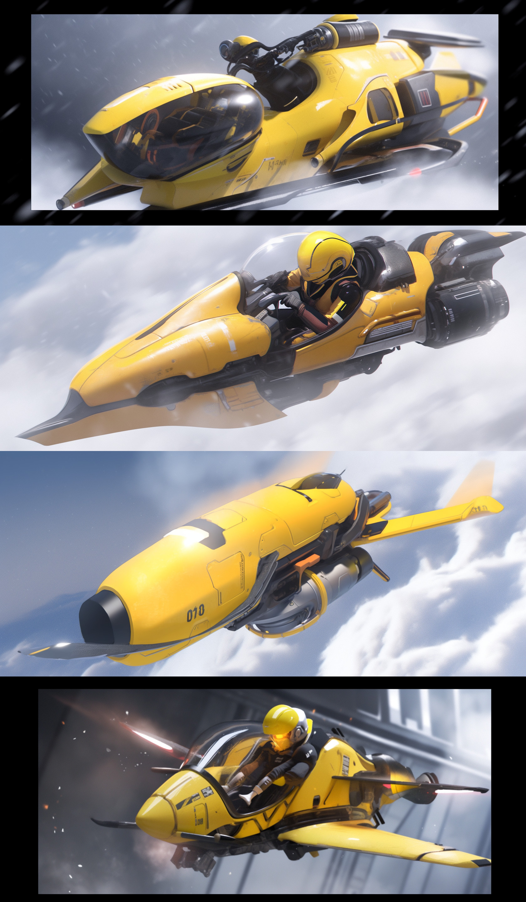a small yellow motorcycle aircraft with 1 engine and a domed windshield, realistic detail, dynamic energy flow, in the style of hyper-realistic sci-fi, realistic forms, aerospace themes --no wheels --niji 5 --ar 35:15 --q .65