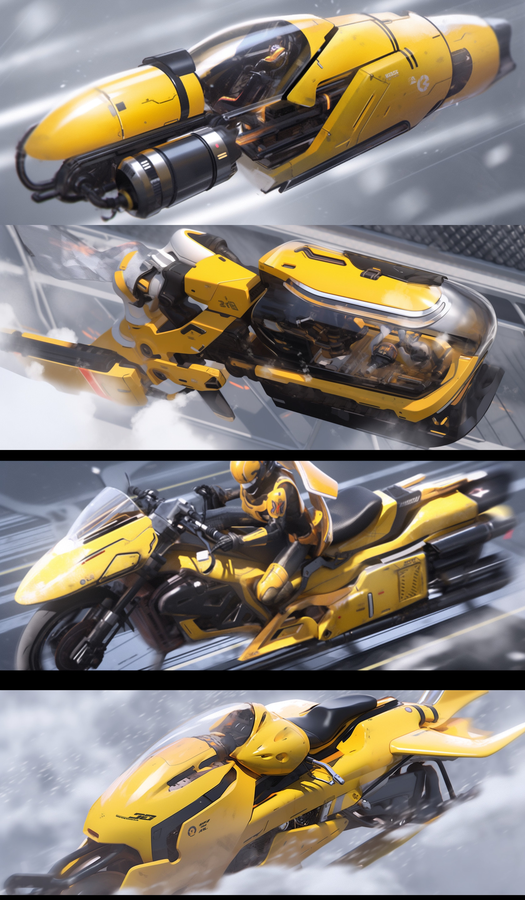 a tiny yellow motorcycle aircraft with a domed windshield, in the style of hyper-realistic sci-fi, exposed jet engine, exposed pipes, small wings --no wheel wheels --niji 5 --ar 35:15 --q .65