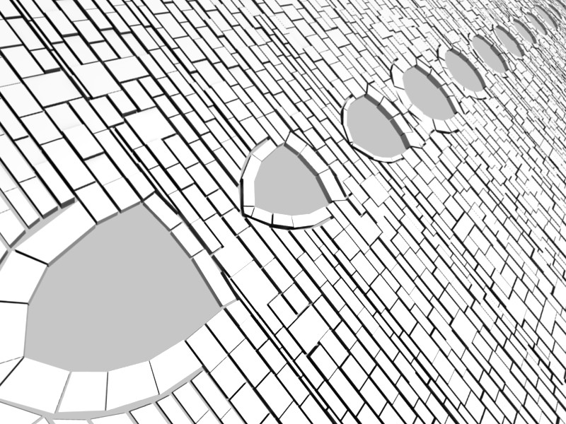 These images are some demonstrations of what can be done with the Auto Masonry script for Blender. Please note that some of these are renders from development versions of the script, so some features didn't survive to a release version. Here is my original code. There is an updated version in the official Blender release. Enable "Add Mesh: Extra Objects" in the Add-ons tab of the user preferences. Then hit Add > Mesh > Extras > Wall factory (Shift-A, M, E, W) and the options will show up in the tool pane.