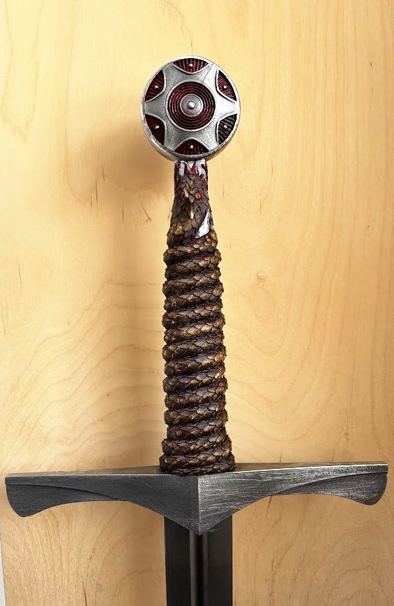 The handle of the St. George Sword showing the Six Days Sun pommel and the snake handle.