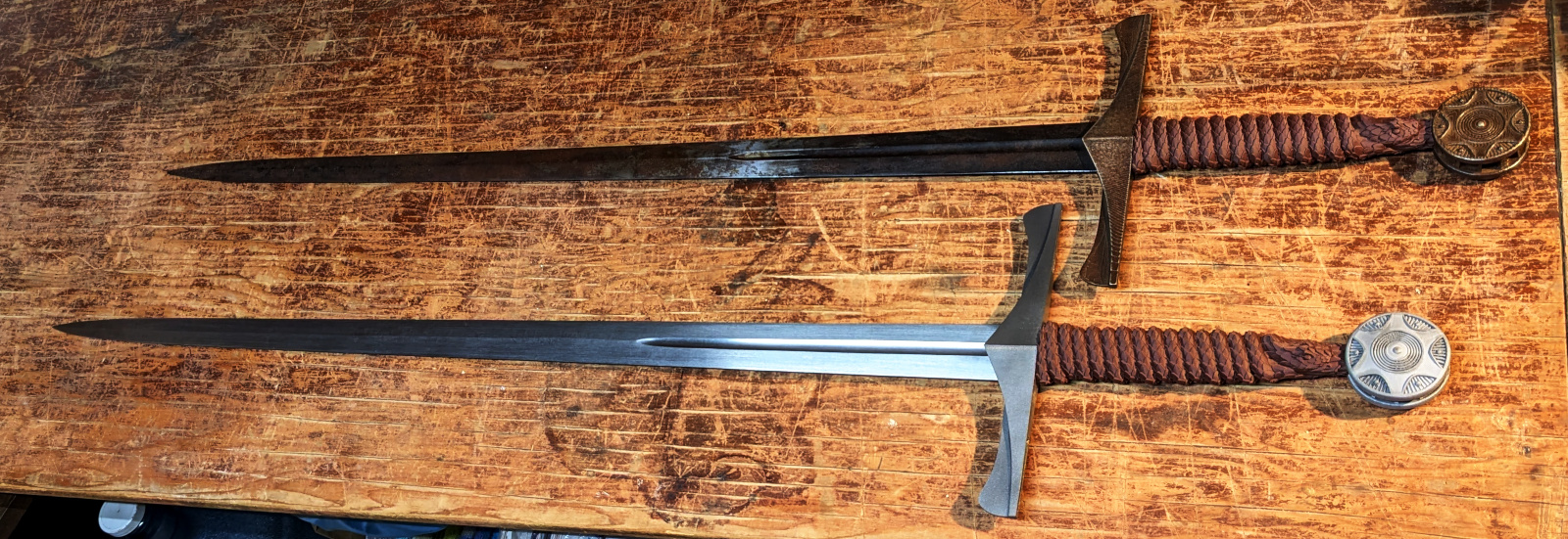 Because the sintered bronze/steel 3D printing tech isn't available right now, I had the metal parts DMLS printed in Titanium (for the crossguard) and 316 SS (for the pommel). The handle grip is printed from wood infused PLA on the office printer. Pictured here next to my own fire-scarred sword.