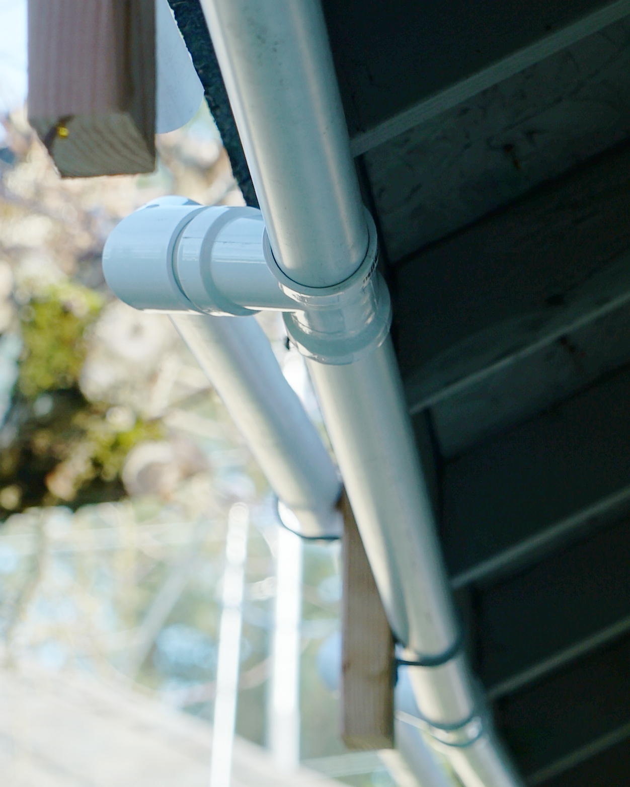 Garage Gutters. The gutters all empty into a closed pipe which carries the rainwater to the rain barrel.