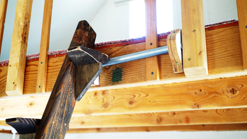 Closeup of the bottom of the stowed ladder. The "foot" of the ladder which helps prevent it twisting in use also rests on the supports while stowed.